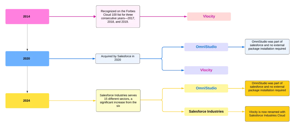 OmniStudio powers the tailored, industry-specific solutions that operate within the newly created section of the Salesforce platform known as Salesforce Industries. Initially developed by Vlocity, an independent company acquired by Salesforce in 2020, OmniStudio was instrumental in bringing the concept of Industry Cloud to the Salesforce CRM ecosystem. Founded in 2014, Vlocity quickly gained traction and was recognized on the Forbes Cloud 100 list for three consecutive years—2017, 2018, and 2019.