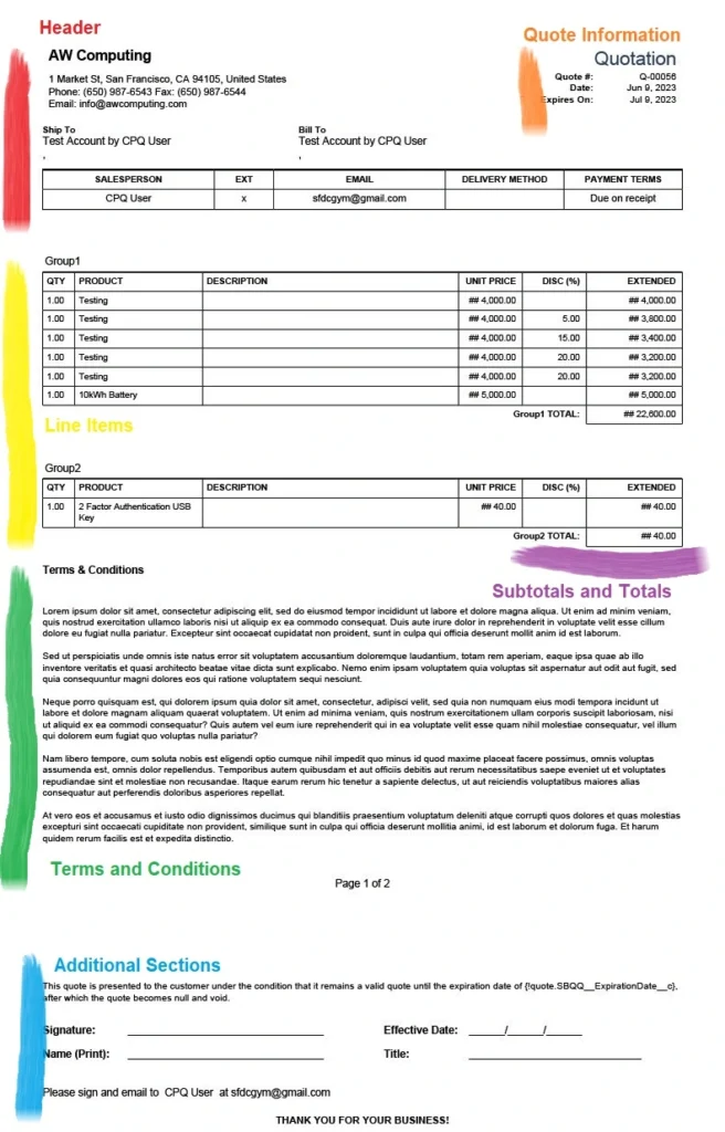 A quote template in Salesforce CPQ is meticulously divided into multiple parts, each of which is fully configurable to meet the unique needs of a business. This modular structure typically includes sections for headers, line items, terms and conditions, and optional product highlights. Each section can be tailored to display relevant data, align with branding requirements, and cater to specific customer preferences. By understanding and leveraging these configurable components, businesses can create cohesive and dynamic quotes that resonate with clients and drive sales success. This structured approach not only enhances organizational efficiency but also fosters a consistent and professional image across all sales communications.
