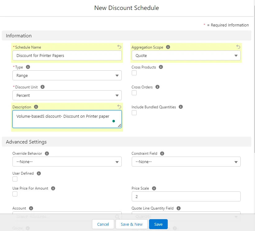 - Finalize and Save Settings:Ensure all the details are correctly entered and save the changes to apply the discount schedule to the specified product. This setup will ensure that your pricing strategy is accurately implemented within the CPQ system.