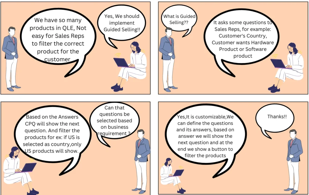 - Guided selling in Salesforce CPQ stands out as a powerful tool that enhances the sales process through clear, structured assistance for sales teams. By focusing on precisely tailored questions stored as Process Input records, it ensures that each sales interaction is aligned with customer needs and expectations. This alignment is made possible through strategic setup involving creating a quote process, defining process inputs, and updating the Quote Process ID on quote records. Emphasizing community support and best practices, implementing guided selling promotes a more insightful and efficient sales experience, benefiting both the sales team and the customers they serve.