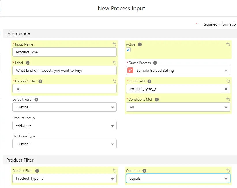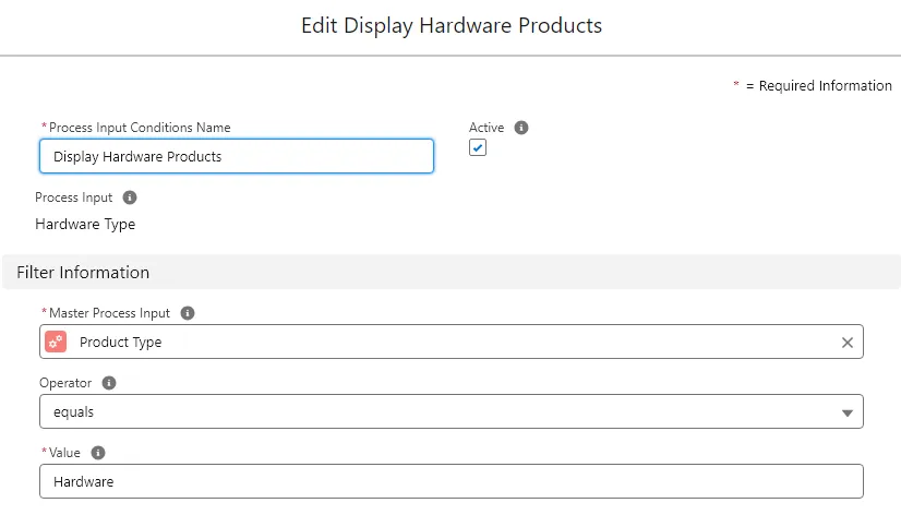 - If customer interest is confined to Hardware Type products, a dependency between questions should be established. To craft this logic, add a Process Input Condition record within the related tab of Process Input.